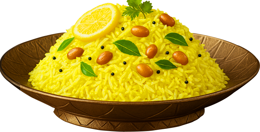 Lemon Rice (Chitranna) is a tangy dish with rice, lemon, mustard seeds, peanuts, and curry leaves. Quick and tasty.